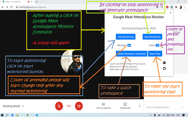 1.开始监控按钮将开始每分钟监控人并收集他/她在会议中的存在与否。每隔一分钟,人员列表将自动从开始滚动到结束以收集信息(他/她的名字)。