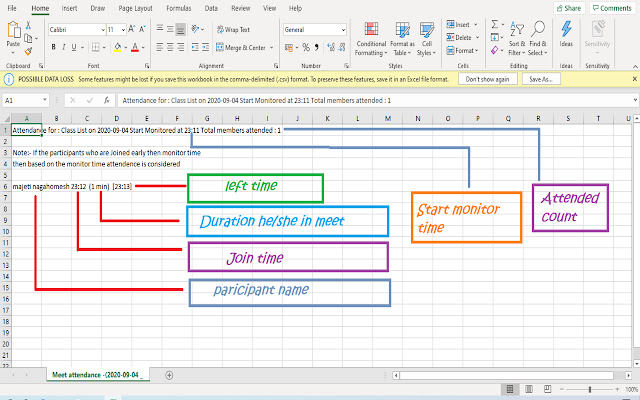2.通过点击停止监控按钮,您将获得一个文件,其中包含有关他/她的加入时间、他/她在会议中发送了多少时间以及他/她的离开时间的信息。如果他/她再次加入,则重复上述相同的信息序列。