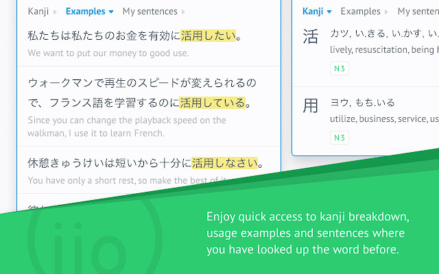 这个 Chrome 扩展与日语 IO (https://www.japanese.io) 协同工作,可以轻松访问字典查找、阅读、汉字和例句,以帮助您阅读日语网页。