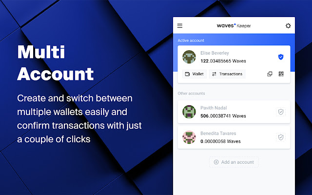 Waves Keeper 专为方便而设计,因此您只需点击几下即可签署交易。用户可以创建多个钱包并轻松地在它们之间切换,如果您忘记了帐户的密码,您可以像往常一样从您的 SEED 中恢复它。