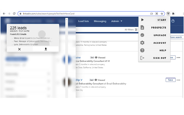 LinkedIn Sales Navigator Scraper 不会干扰其他流行的电子邮件地址查找 Chrome 扩展程序,包括 Clearbit、hunter.io 等——我们实际上将这些包含在您的计划中,不收取额外费用!只需使用此工具抓取个人资料信息,然后将其导出为 CSV!在我们的 v1 更新中,我们包含了电子邮件查找 + 电子邮件验证,使其成为一个多合一的 B2B 勘探工具!
