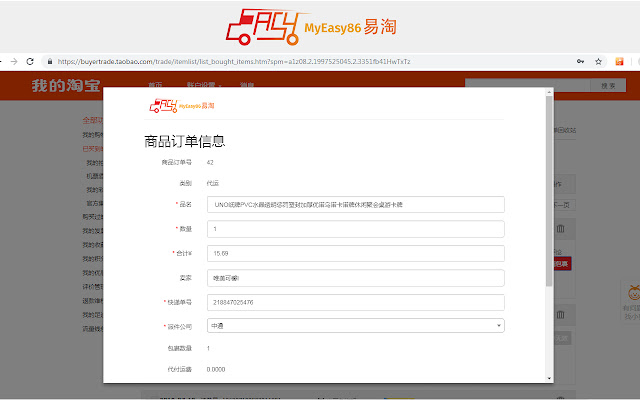 1. 代运 - 您可以在淘宝/天猫已买到宝贝的页面点击 “添加包裹”,就可以直接提交代收货信息到MyEasy86网站。此外,您也可以编辑已添加包裹。