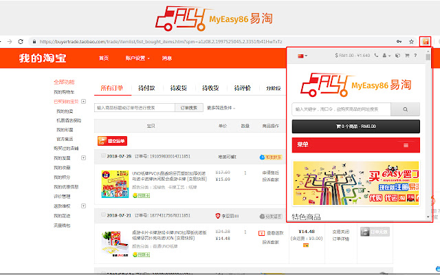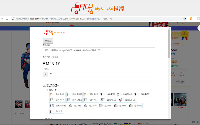 MyEasy86代购和代运助手。您可以在淘宝/天猫商品的页面,直接添加商品到MyEasy86购物车。此外,您也可以在淘宝已买到宝贝的页面,直接提交代收货信息到MyEasy86网站。