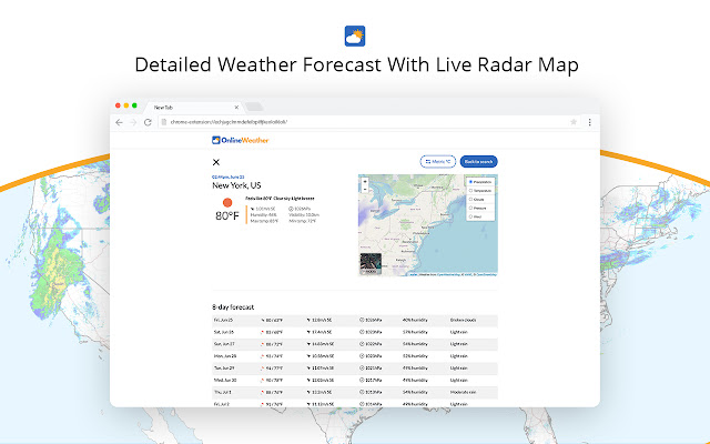 将浏览器的新标签页替换为具有快速天气搜索、待办事项列表、笔记等功能的在线天气 Chrome 新标签扩展,获得灵感并改善您的 Google Chrome 体验。通过选择您所在的城市或世界上的任何城市来个性化您的天气搜索体验。从您的新标签页轻松访问当前天气状况、每小时预报和 5 天预报。