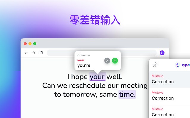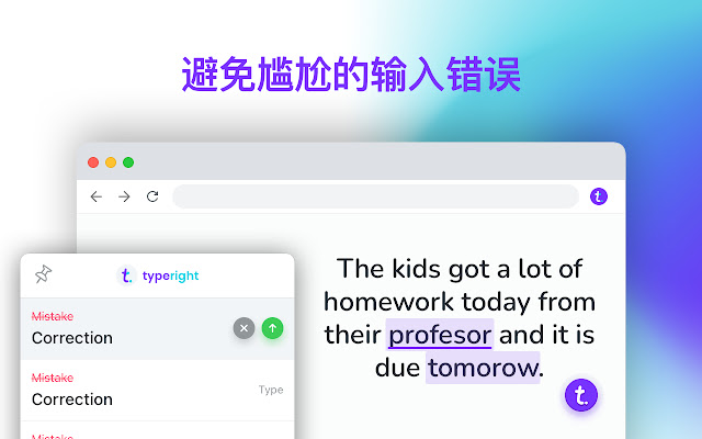 安装 Typeright 应用程序,立即更正语法、拼写和标点符号错误。将沟通技巧提升一个水平,并培养信心!