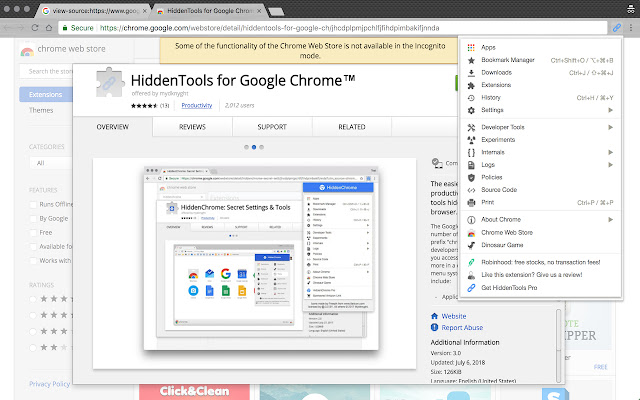 许多高级用户和开发人员都知道,Google Chrome™ 浏览器在 pfix“chrome://”下隐藏了许多设置和工具。 HiddenTools 让您可以在方便、高效且美观的菜单系统中访问所有这些 Chrome 页面以及更多内容。可访问的 Chrome 页面包括: