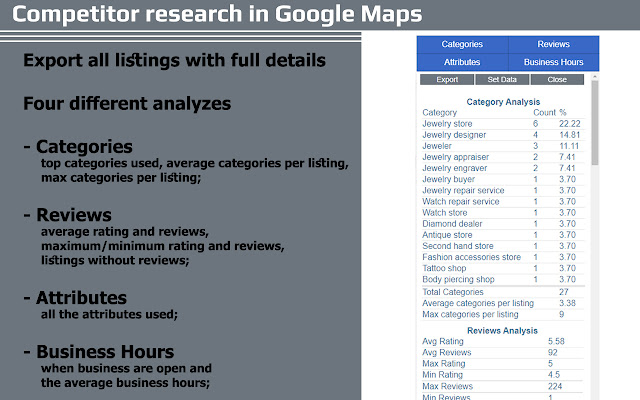 使用此扩展程序,您可以获得地图、本地查找器、知识面板中每个 google my business 列表的详细信息,并根据地图搜索结果进行四种不同的分析。