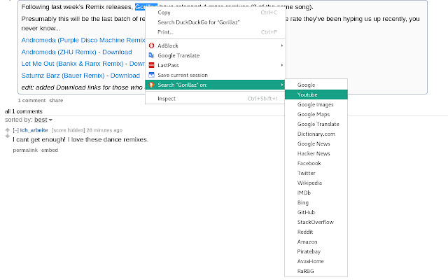 - 添加上下文菜单以使用 DuckDuckGo !bangs 搜索所选文本。