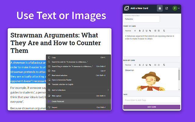 - 选择一些文字,右击创建抽认卡,快速创建卡片。