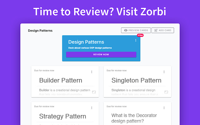 - Zorbi 会提醒您什么时候复习要记住的卡片,这样您就再也不会忘记它们了。