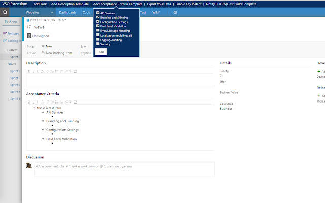 - 添加一个标准化模板,用于从弹出窗口中填写工作项的描述