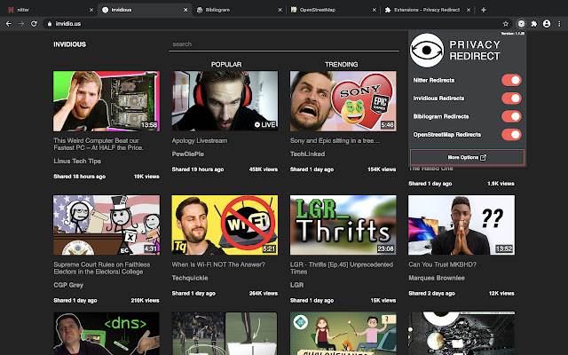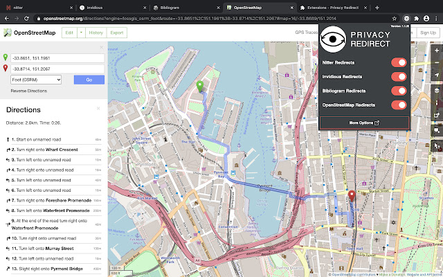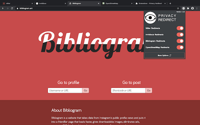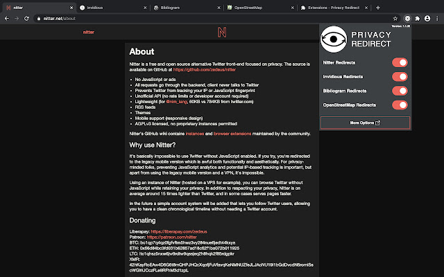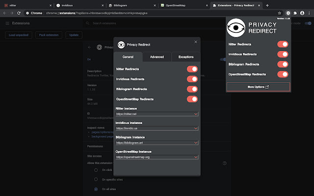 将 Twitter、YouTube、Instagram 和 Google地图重定向至尊重隐私的替代品: Nitter、Invidious、Bibliogram 和 OpenStreetMap。
