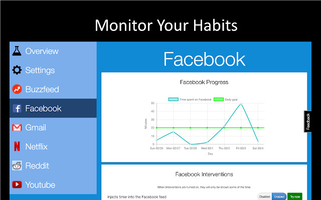 每次您访问这些网站时,我们都会智能地选择干预措施(使用隐藏您的新闻提要、隐藏评论、暂停视频等技术)来帮助您减少在网站上的时间。如果您不喜欢干预,您可以选择禁用它。