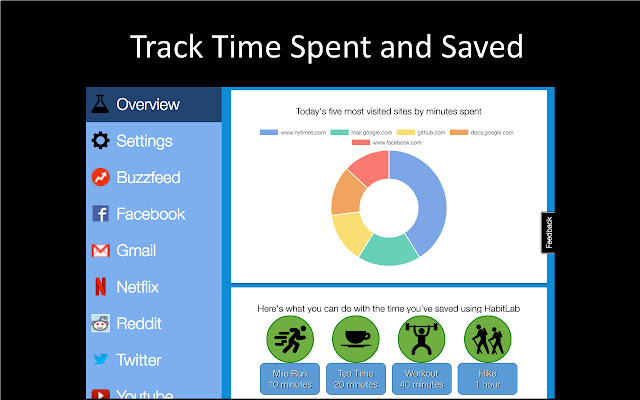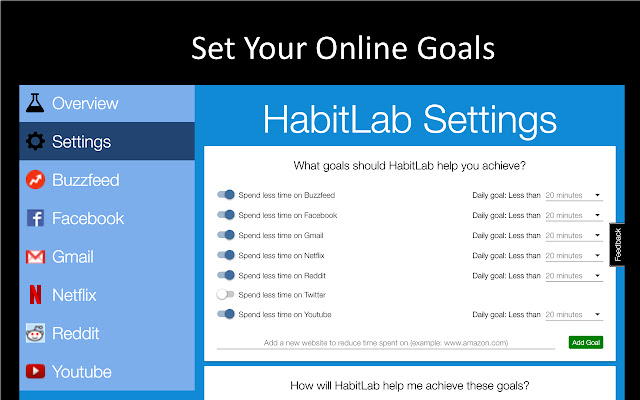 告诉 HabitLab 你想在哪些网站上花费更少的时间。我们支持最流行的网站,如 Facebook、Youtube、Reddit、Buzzfeed、Netflix 等 - 您还可以添加任何您想要的网站。