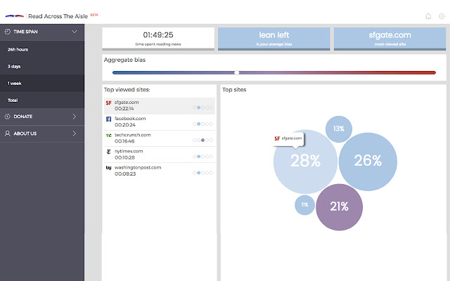 Read Across The Aisle 为您提供过滤气泡的视觉表现。我们的仪表板会向您显示您阅读最多的新闻网站,以便您了解自己阅读时间最多的地方。使用视图选项,您可以只查看过去 24 小时、一周,甚至是不确定的历史记录,以便您可以跟踪一段时间内的行为。