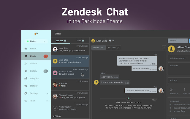 使用 Zendesk 工具和服务的深色主题日夜呵护您的眼睛。