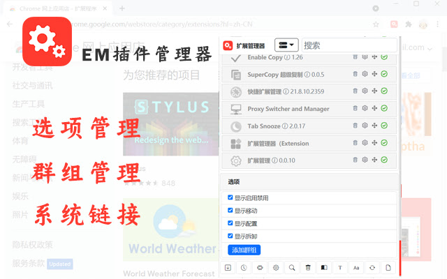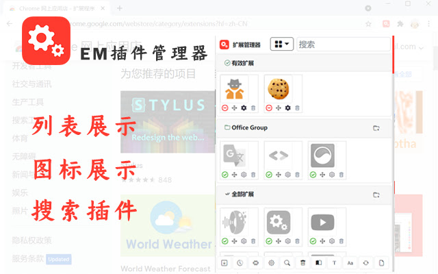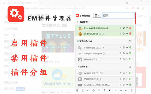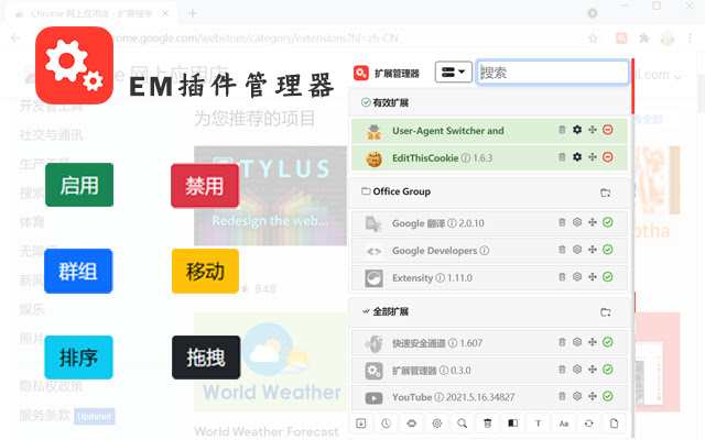 管理chrome插件,一键启用/禁用插件,释放系统资源,给插件分组,给插件自定义排序,拖动到群组即可分组,拖动顺序即可排序。比chrome自带的扩展程序使用方便,功能强大。