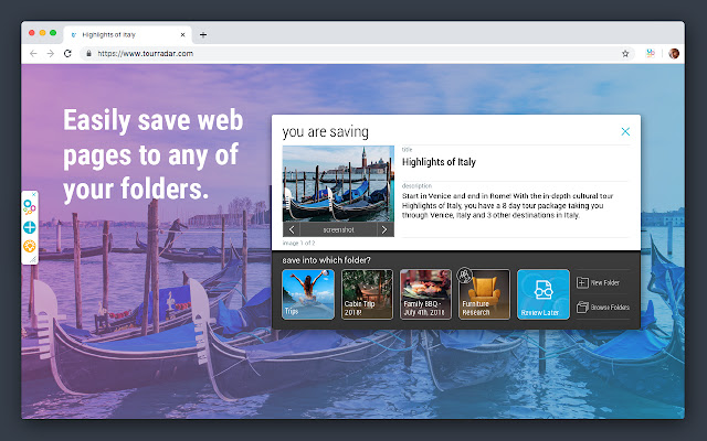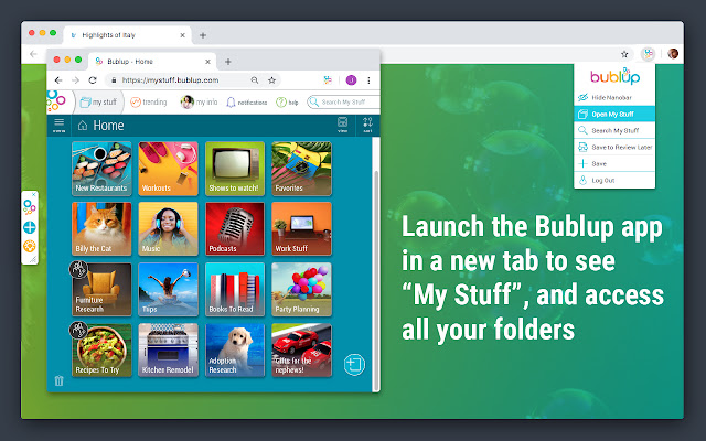 * 超级轻松地将任何网页、文章、视频等保存到您的 Bublup 文件夹中。