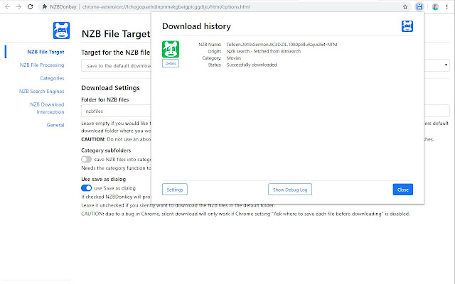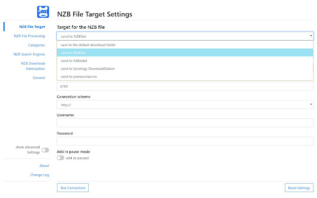 * 为 NZB 文件设置目标:下载到浏览器下载文件夹或直接发送到 SABnzbd、NZBGet、Synology DownloadStation 或 pmiumize.me 下载服务