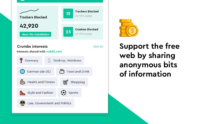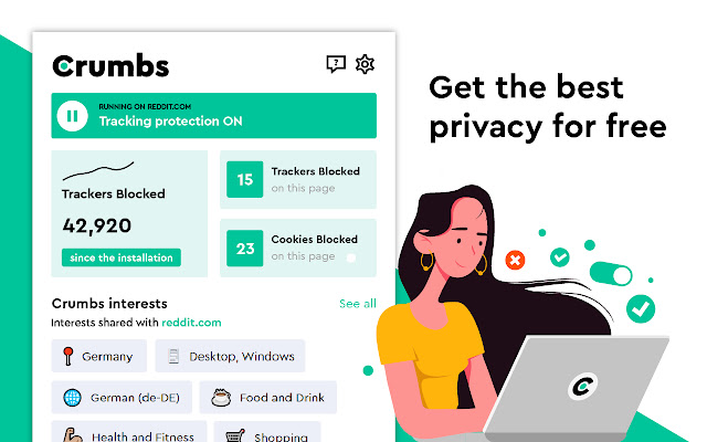 Crumbs 保护您的隐私并确保没有人可以将您描述为个人。此外,您可以控制您的在线身份并匿名分享您的兴趣以支持免费网络!那是好消息。如果您完全不喜欢广告,Crumbs 可以与 Adblock Plus 完美同步。