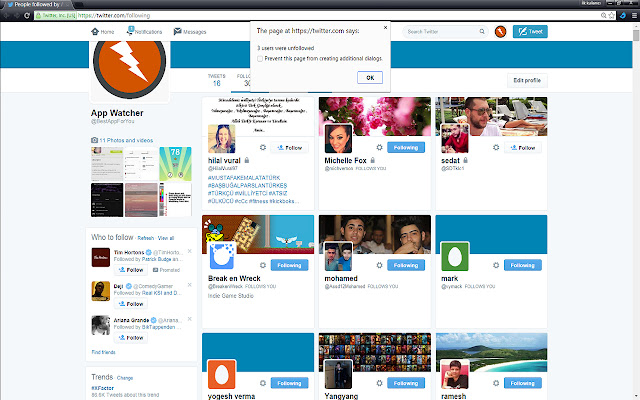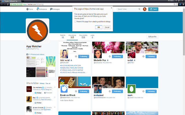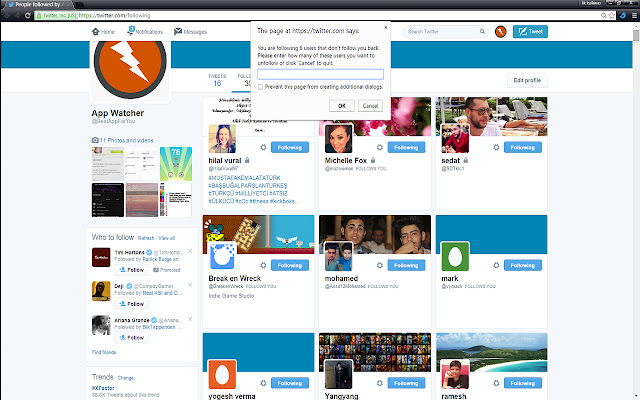 一旦您单击扩展图标,它就会将您带到您的 Twitter 帐户的以下部分。会弹出一个确认信息,如果您单击“确定”,页面将开始向下滚动并加载您关注的所有人员。加载所有用户后,它会计算有多少人没有立即关注您并打印出数字以及您想要取消关注的人数。您可以随时单击取消按钮来取消该过程,就是这样!现在你可以取消关注那些不关注你的人了!