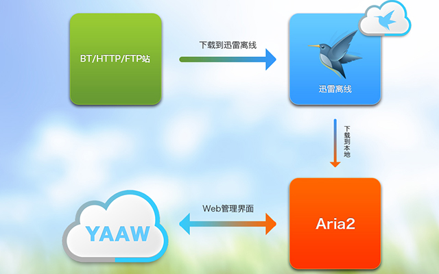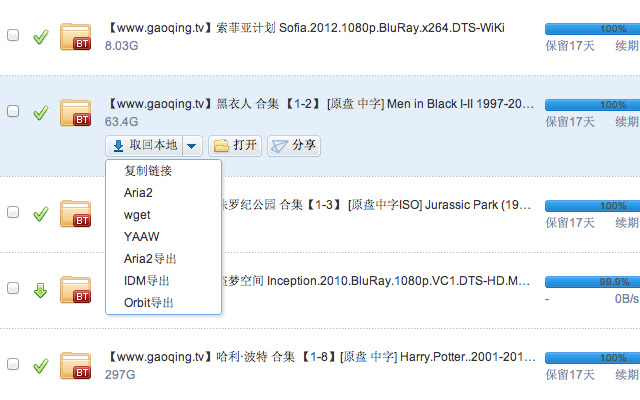 可以方便的把迅雷离线的下载地址导出到aria2/aria2-rpc/wget/IDM/Orbit,支持YAAW。