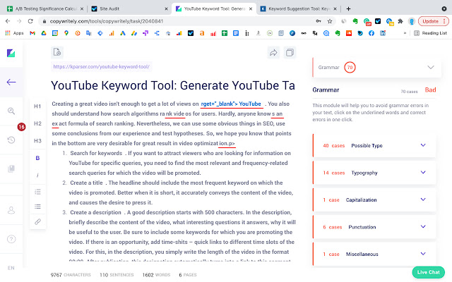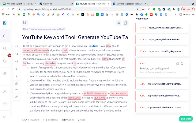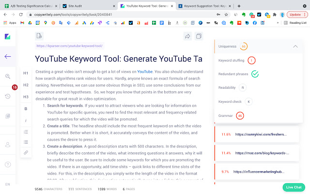 3. 检测关键字堆砌。找出使您的文本成为垃圾邮件和停用词的词。获取建议最好使用文本中的每个单词多少次以避免垃圾邮件。