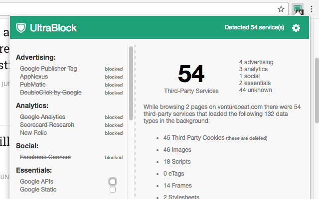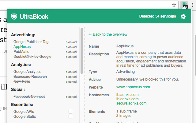 UltraBlock 维护一个手动检查的跟踪器数据库,其中包含 5.471 个外部服务主机名。这些服务分为广告、分析、社交和基本服务。良好浏览体验所不需要的服务被标记为“不必要”。使用此数据库 UltraBlock 会自动阻止您不需要的广告和跟踪器。 UltraBlock 会准确显示在您访问的网站的后台加载了哪些服务。