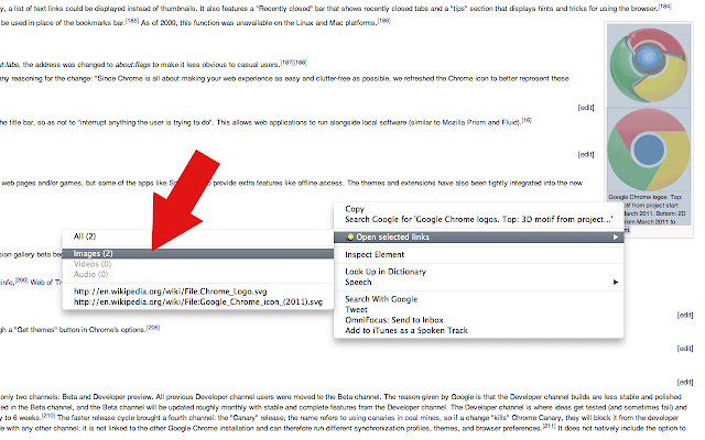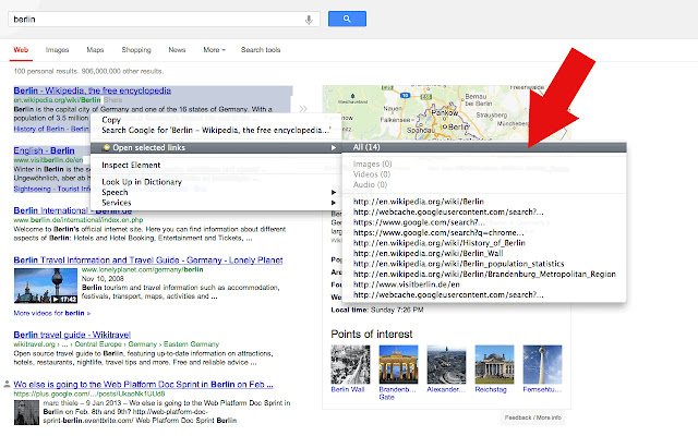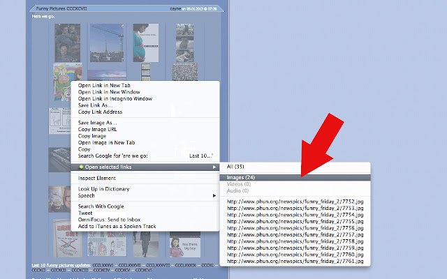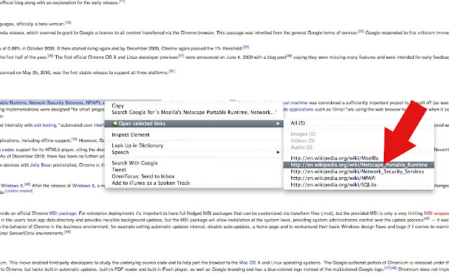 安装后确保重新启动浏览器或重新加载网站。选择包含链接的网页的某些部分。右键单击并从上下文菜单中选择“打开选定的链接”->“全部”。它们现在将在您当前选项卡的右侧打开。上下文菜单显示将打开多少页。它还显示前 10 个 url。