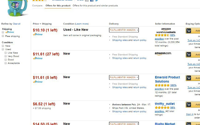 查看您的亚马逊竞争对手当前剩余的库存。只需在亚马逊商品列表页面上浏览产品的已用商品和新商品,然后单击 Google Chrome 工具栏上的间谍图标即可。您将在十秒钟内看到页面上所有优惠的库存数量!