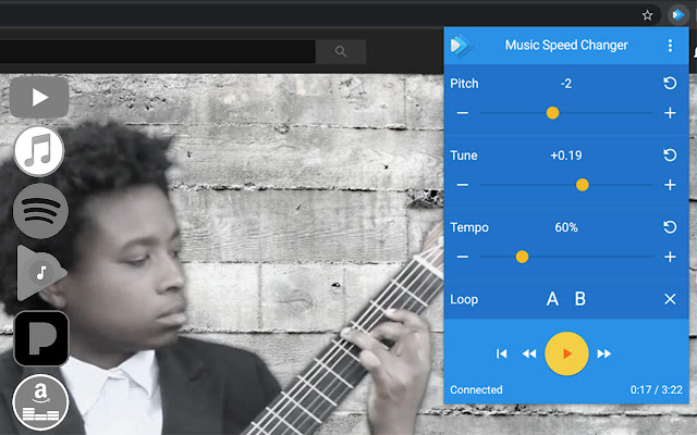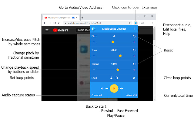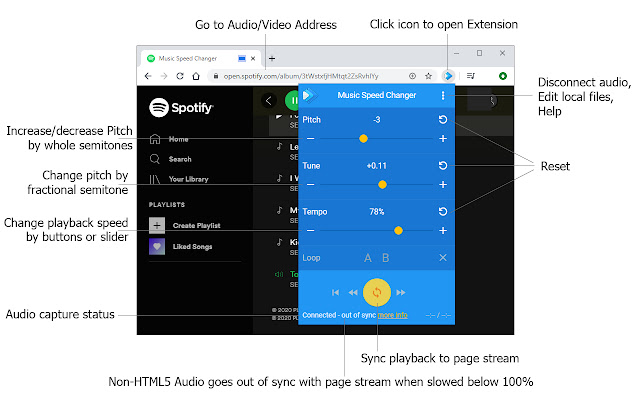 + 时间拉伸 - 将在线视频和一些流媒体音乐网站的速度从原始速度的 25% 更改为 250%。