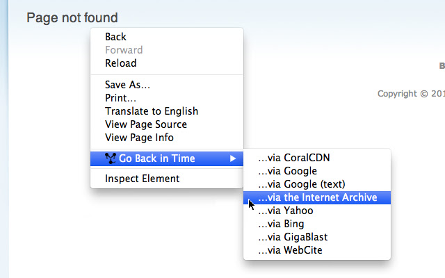 基于 Firefox 插件 Resurrect Pages,“Go Back in Time”允许您通过以下缓存/镜像服务查看网页的缓存版本: