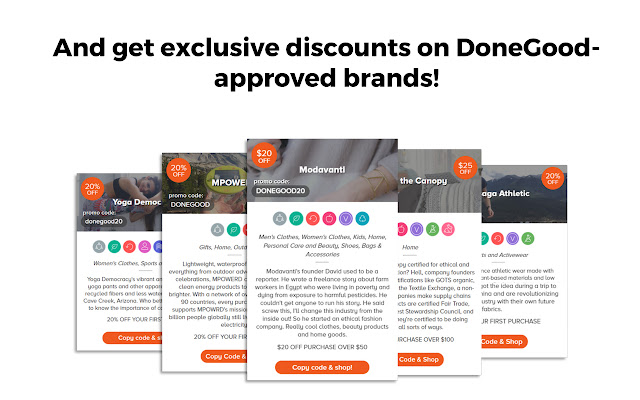 当您在亚马逊、谷歌或其他零售网站上购物时,DoneGood 的在线购物助手会自动推荐最合乎道德、可持续发展的品牌。此外,通过独家优惠和折扣代码可享受 25% 或更多的折扣,您可以轻松购物,同时省钱。