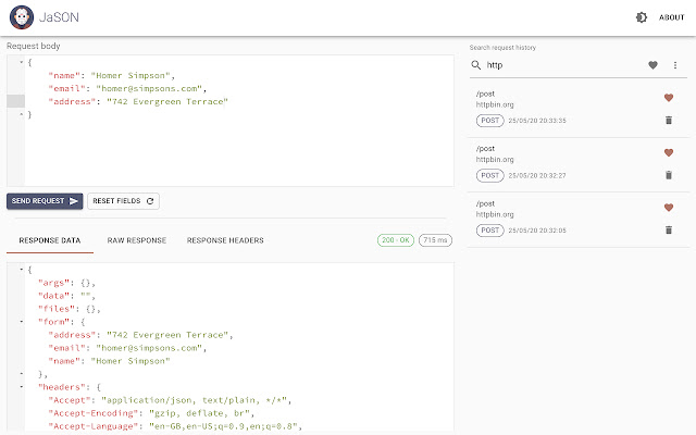使用全文搜索保留请求历史记录。可以删除单个历史记录项目,或将其标记为“收藏夹”以便于访问。 JaSON 以前版本的历史记录将自动迁移。在 IndexedDB 中存储历史记录以提高性能。