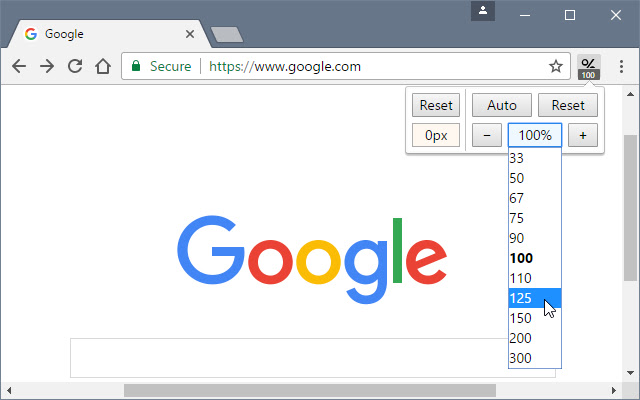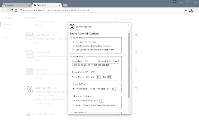 缩放页面 WE 提供了使用整页缩放、纯文本缩放和最小字体大小缩放网页(每个站点或每个标签)的工具。 AutoFit(适合宽度)缩放可以手动或自动应用。可以缩放小图像以适合浏览器窗口。