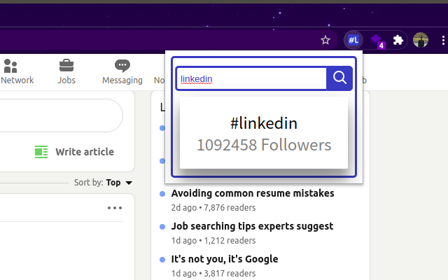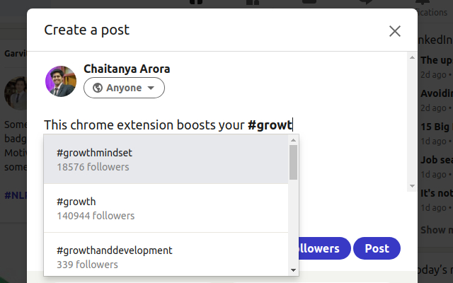 发布时选择 LinkedIn 上最好的主题标签,实时关注者数量和易于使用的搜索栏集成。