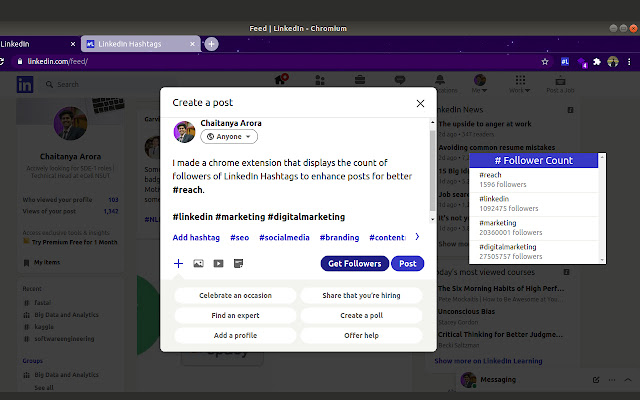 反映 LinkedIn Hashtags 关注者数量的分析工具,以增强您的帖子以获得更好的影响力。