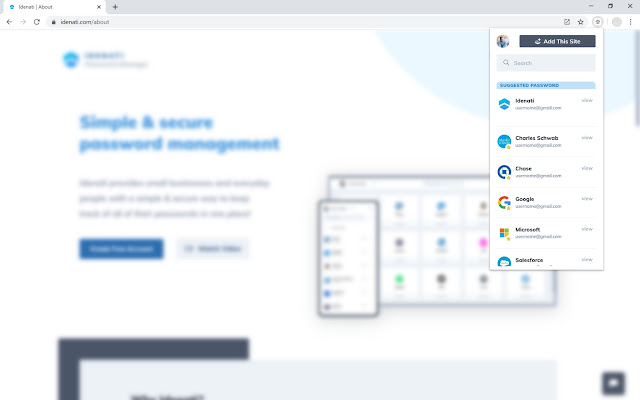 在 https://idenati.com/?ref=chromeExt 创建免费帐户后,使用此扩展程序可以在浏览网页时快速访问您的密码并添加新网站。