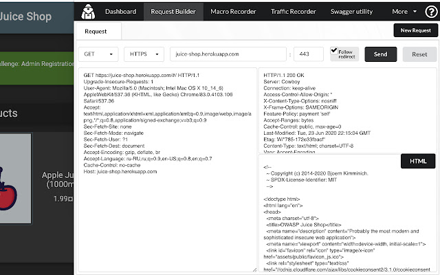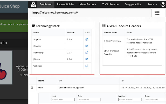 基于 Wappalyzer NPM 模块,PTK 提供了一条关于技术堆栈、安全标头、爬取的链接和域的深入信息。详细的流量日志允许用户在 R-Builder 中重复请求或发送给 R-Attacker 进行攻击,并对任何特定请求执行 XSS、SQL 或 OS 命令注入。