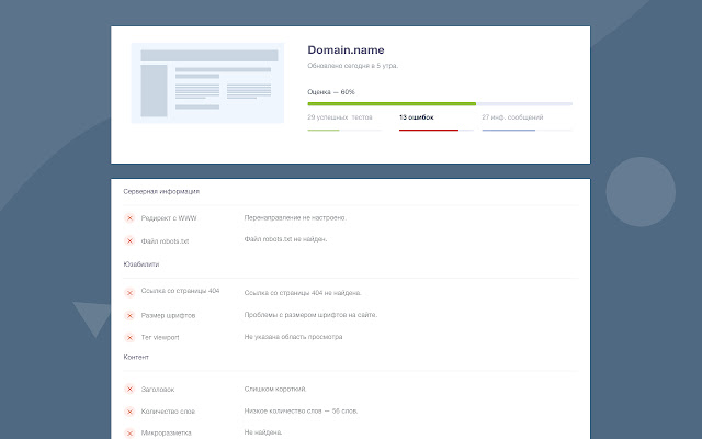 检查是透明的 - 您将看到每个测试的解释,因此即使是新手优化器也会了解服务正在分析什么样的指标。提示可以在点击时调用或隐藏 - 如果您是专业人士并且不需要提示,他们不会干扰您。