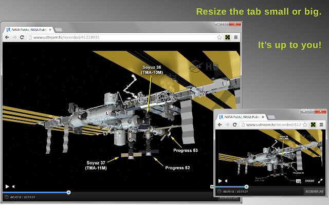 ✓ 类似于全屏观看视频,只是在可调整大小的 Chrome 标签中(广告不会被删除)。