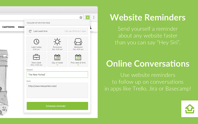 为自己添加书签或发送网页。添加备注和计划以在指定时间(例如周末)到达您的收件箱。