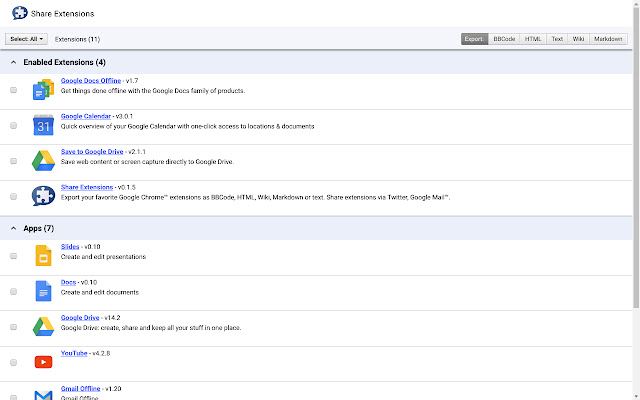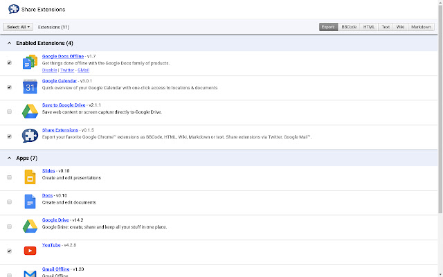 将您最喜欢的 Google Chrome™ 扩展导出为 BBCode、HTML、Wiki、Markdown 或文本。通过 Twitter、Google Mail™ 共享扩展。