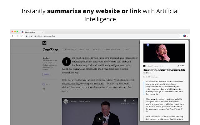 使用人工智能即时总结任何视频、新闻文章、博客、链接或网页。摘要框是一个摘要工具,可帮助您更快地阅读文章或观看视频。它通过使用文本摘要器 AI 工作。文本摘要从文章或视频中提取关键句子,并在经过大量数据训练后能够做到这一点。