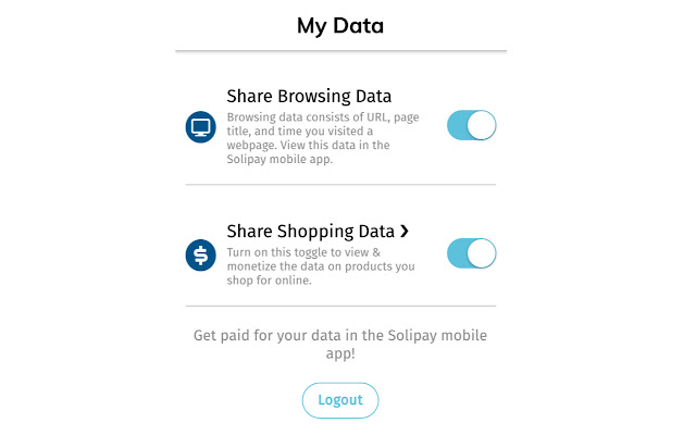 如果您想通过切换开关将浏览数据货币化,Solipay Chrome 扩展程序可让您根据自己的条件决定。当您想共享浏览数据时打开开关,不想共享时将其关闭。就这么简单。