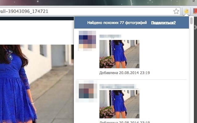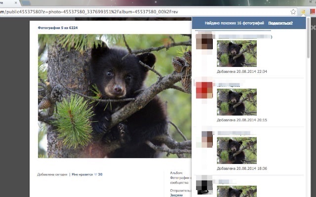 使用此扩展程序,您可以在 VKontakte 社交网络上快速找到您或其他照片的副本。只需打开您需要的照片,然后单击应用程序图标。