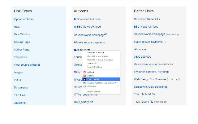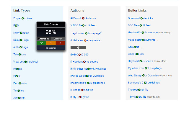 除了检查页面上的所有链接外,您还可以单击弹出窗口中的绿色、琥珀色和红色部分以查看方便列表中的链接。从那里您甚至可以单击链接以查找它在页面上的位置(只要它没有被父元素隐藏)。