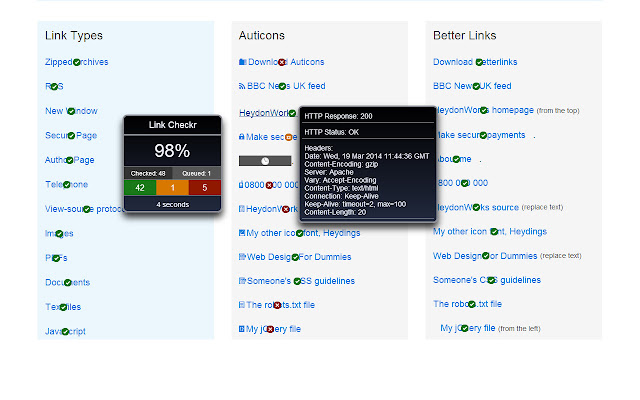 此扩展程序运行当前活动网页上的所有链接,并内联显示它们的响应状态,并在一个方便的小弹出窗口中作为整体显示。查看完成的百分比、好的、坏的和警告链接的数量,以及报告用了多长时间。