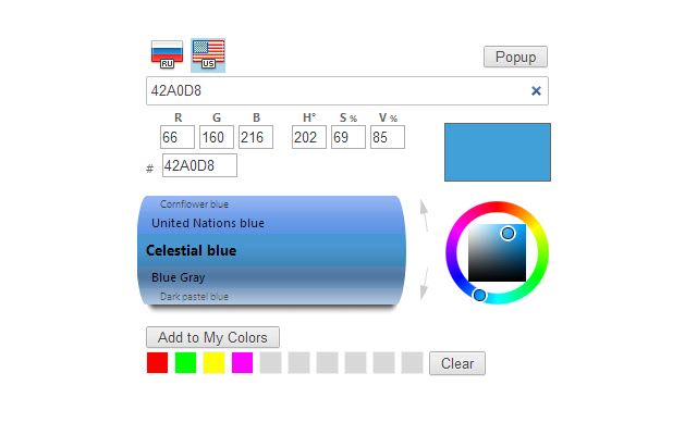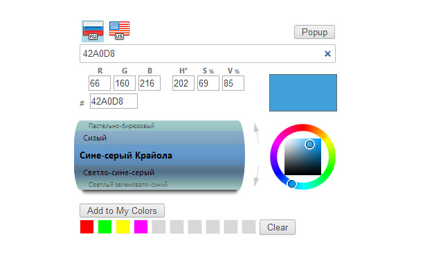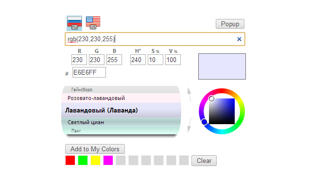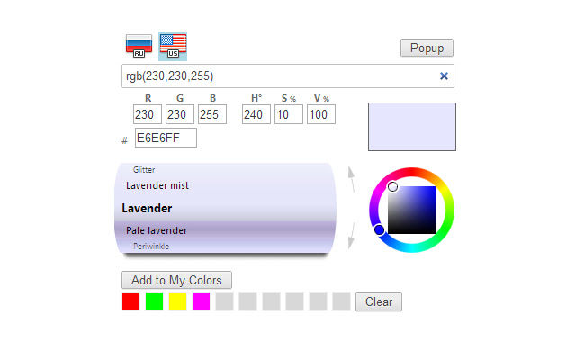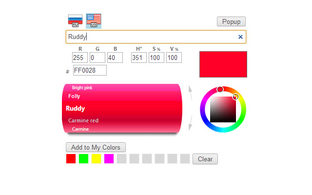 颜色空间是通常意义上的不寻常颜色选择器。您知道许多颜色都有自己的名字:“桃色”、“卡其色”、“蒙巴顿粉红色”、“橄榄绿 Crayola”,甚至还有“昏昏欲睡的青蛙”等有趣的名字。此扩展程序允许您按名称查找颜色。试想一下,数据库中有大约 1000 种色调!此外,您可以通过 hex、rgb、hsv 值或使用色轮选择颜色,扩展程序将同时选择与您最接近的颜色名称。