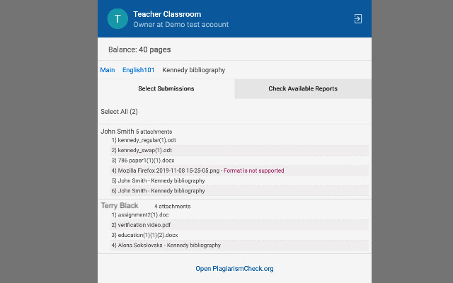 教师和学生使用 PlagirismCheck.org 扩展程序检查提交到 Google Classroom 的文件是否存在抄袭。虽然学生只能访问个人提交的内容,但教师可以检查和查看他们班级中的所有提交内容。无需在浏览器中打开多个选项卡即可获得相似度分数,所有这些都可以在一个简单且用户友好的界面中完成。